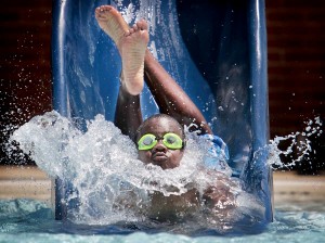 アメリカの首都ワシントンにあるヤーズ公園で、水の壁につっこむ少女たち 6月21日
