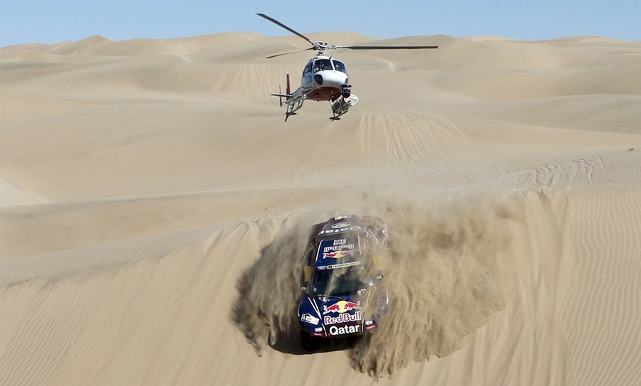 カタールのナセル・アル・アッティヤとその同僚スペインのルーカス・クルース・チームの上を飛んでゆくヘリコプター。2013年ダカール・ラリーは第4ステージに入り、ペルーのナスカからチリのサンチャゴ間で、1月20日まで争われる。1月8日。