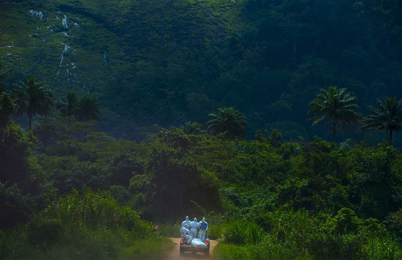 11月7日リベリア、ヴォインジャマ、エボラ出血熱で死亡した住民の埋葬に向かう、ロファ郡保健所の埋葬班。